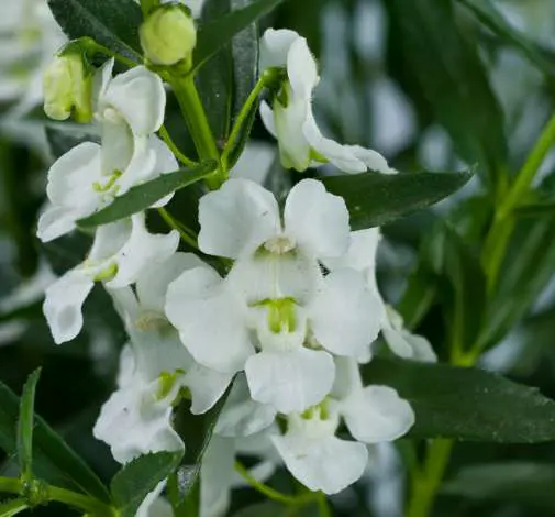 Angelonia Big Snow has large, white blooms on spikes with dark, narrow, green leaves.