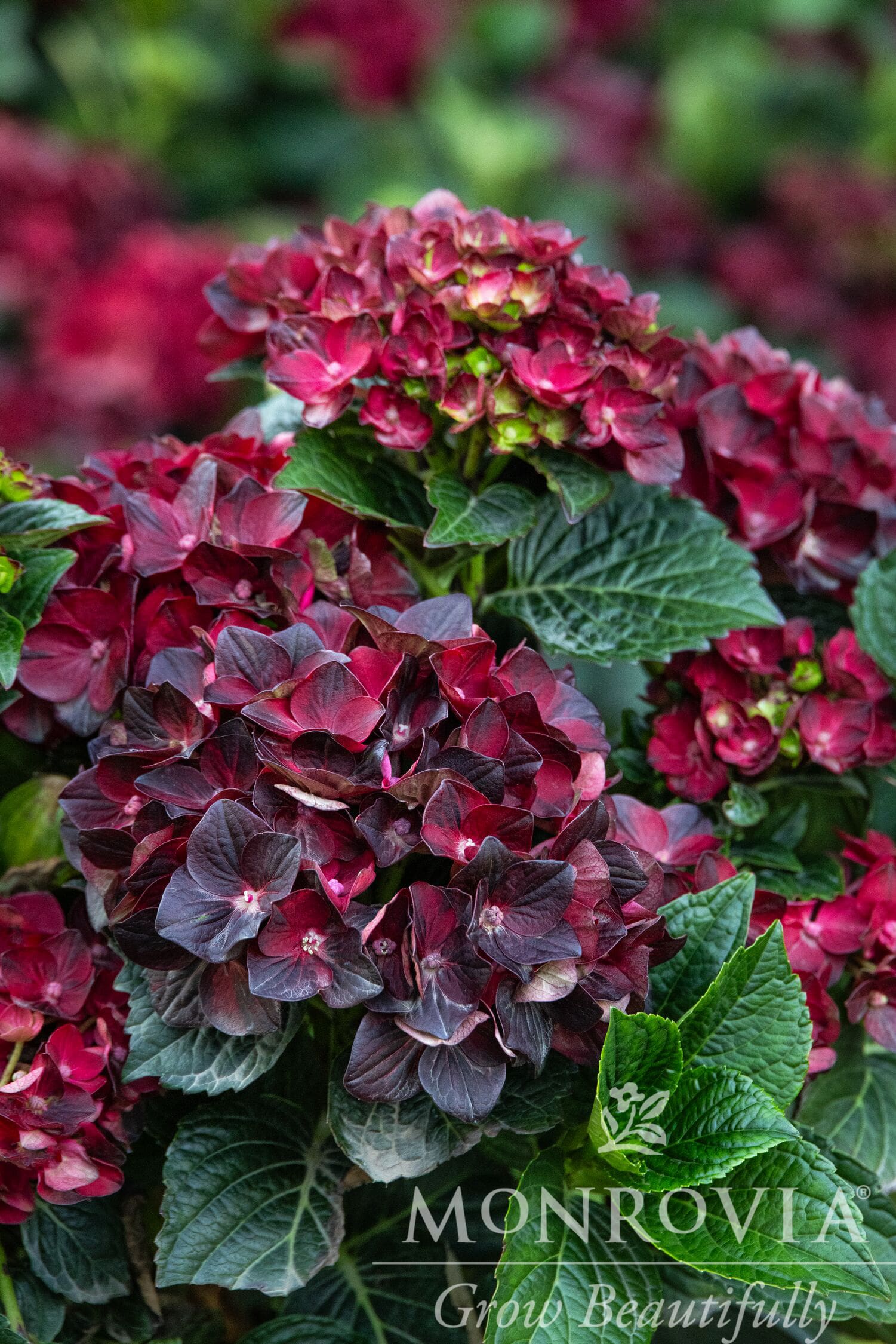 The rich ruby-red mophead blooms deepen in color as the long-lasting flowers age, sometimes taking on almost black hues. Exceptionally sturdy and compact, with strong stems and thick green leaves.